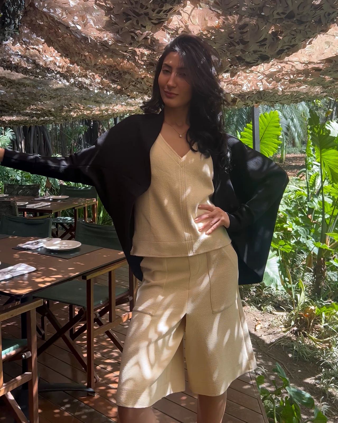 Bermuda Bruna confeccionada em tecido estruturado com leve textura, oferecendo caimento elegante e confortável. O modelo apresenta cintura alta com passantes para cinto, bolsos frontais amplos e comprimento sofisticado, ideal para compor looks versáteis do dia a dia ao trabalho. Uma peça moderna e atemporal para o seu guarda-roupa.