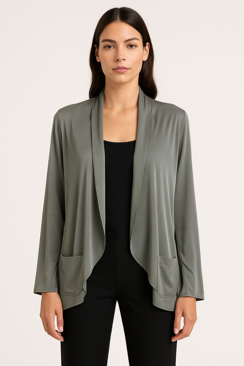 Com bolsos funcionais e um design assimétrico, este casaco oferece estilo e praticidade. Sua parte traseira mais curta o torna perfeito para diversas situações, desde o ar condicionado do escritório até um fim de tarde no parque ou na praia. Prepare-se para manhãs mais frescas com este casaco coringa que combina elegância e conforto de maneira única.