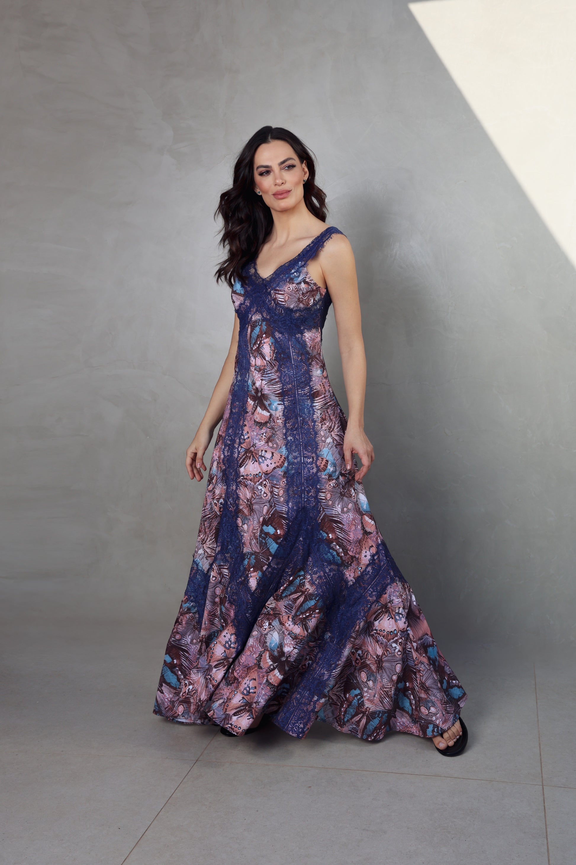 Vestido Longo Fluity com Estampa de Borboletas e Renda