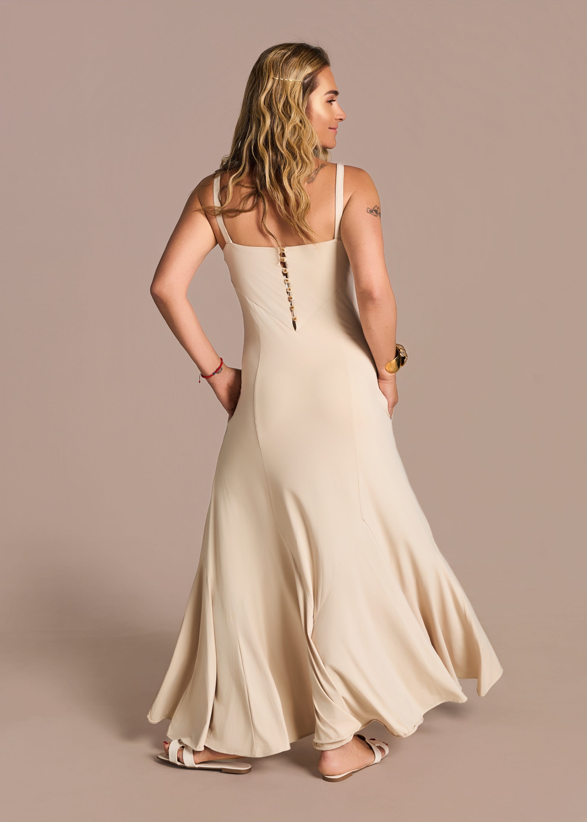 Em jersey com caimento fluido e toque macio. Modelagem alongada e levemente evasê, que desenha a silhueta com conforto e movimento. Alças finas e recorte elegante valorizam o colo, enquanto a saia amplia o balanço natural da peça. Ideal para quem busca leveza e sofisticação no vestir.